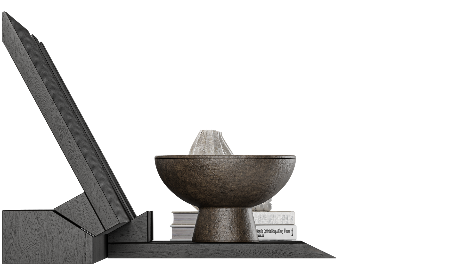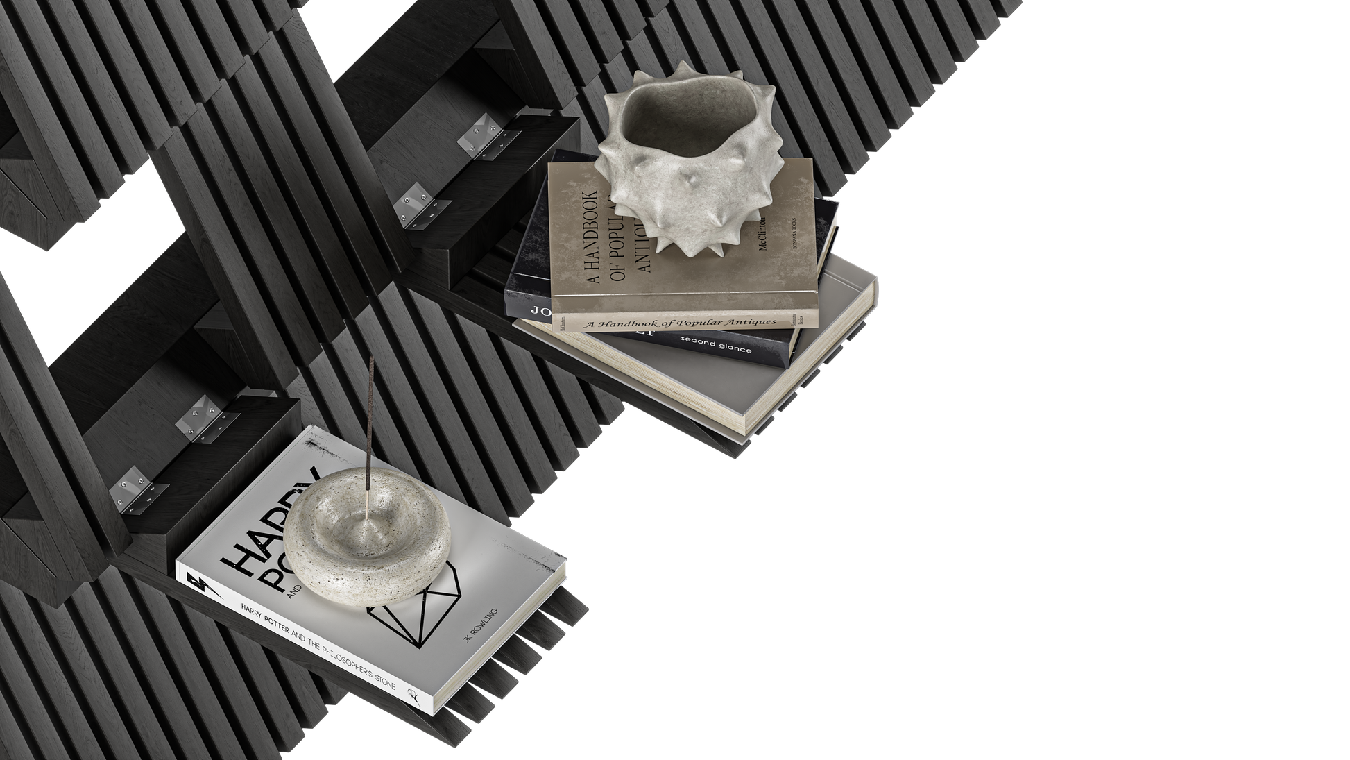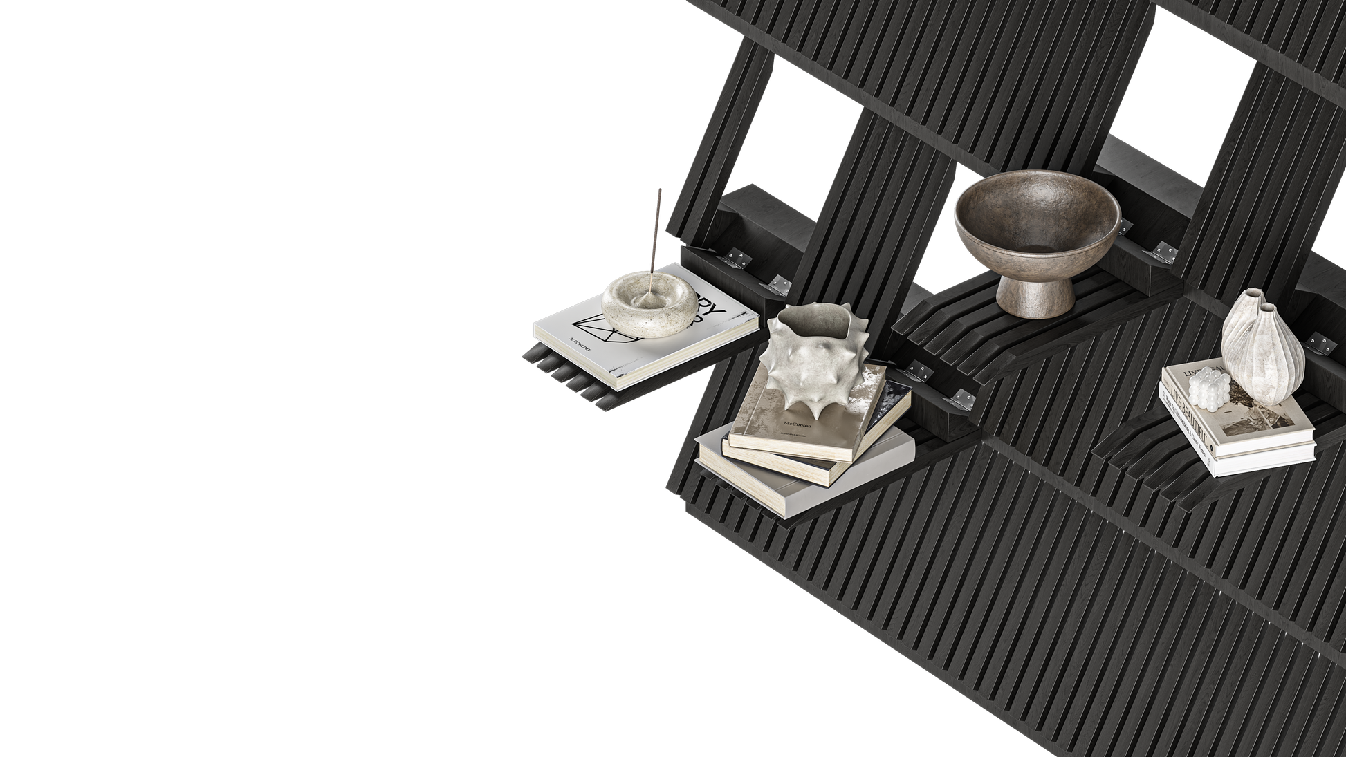 Perfect for displaying books, ceramics, or collectibles, each angled tier offers both function and visual intrigue. Whether styled minimally or brimming with personality, the Clutch adds dramatic texture and structure to any space — from creative studios to modern living rooms.