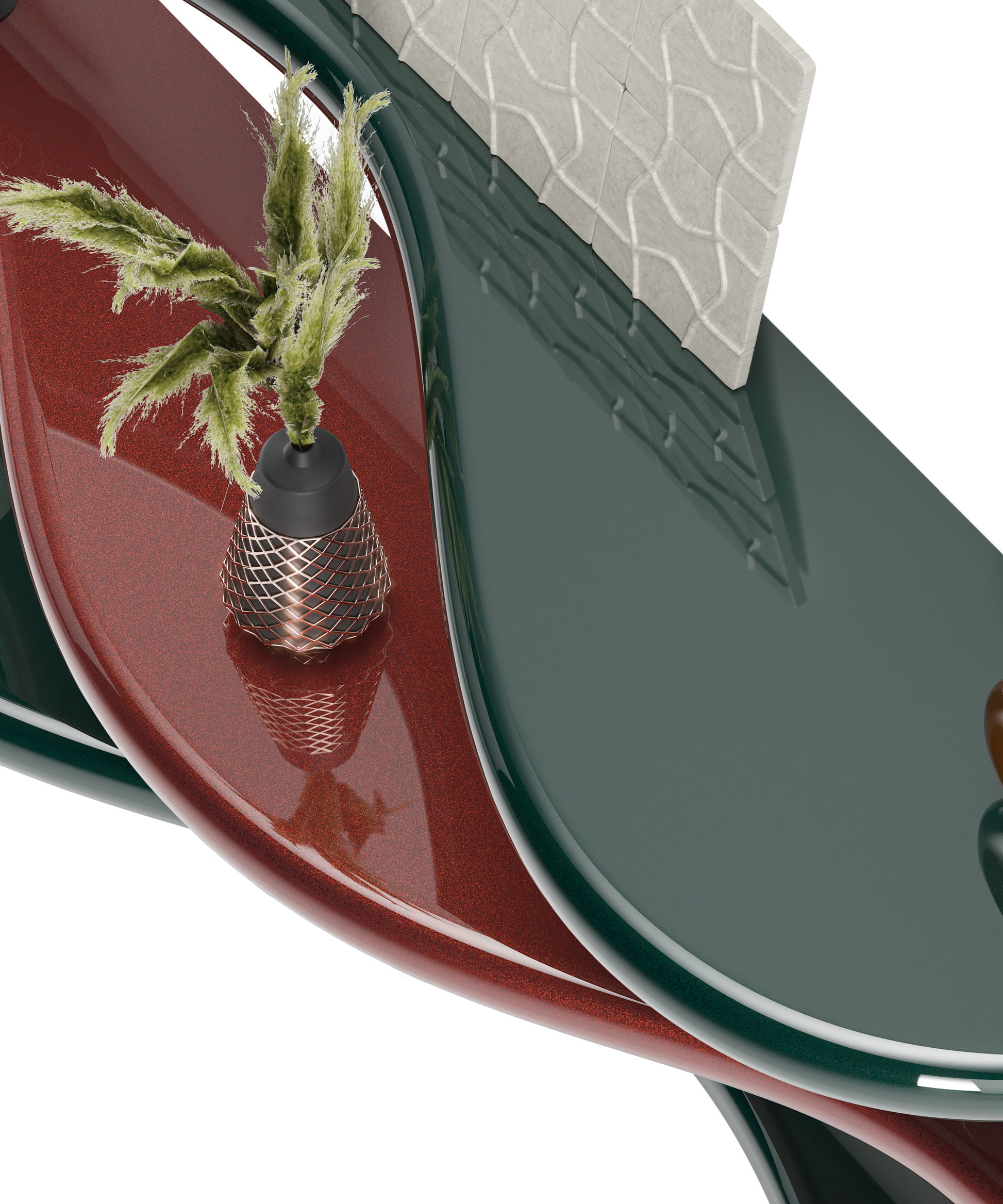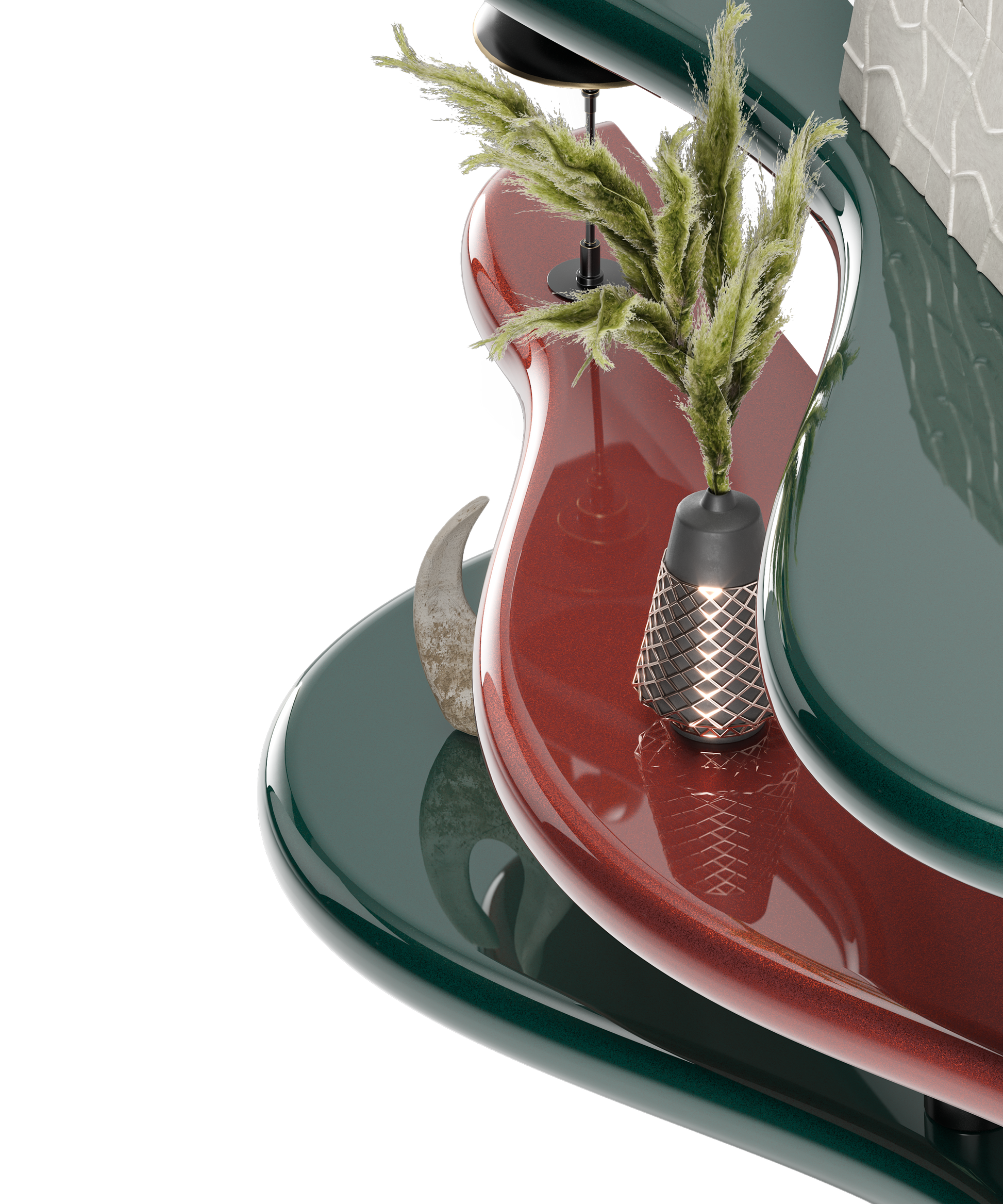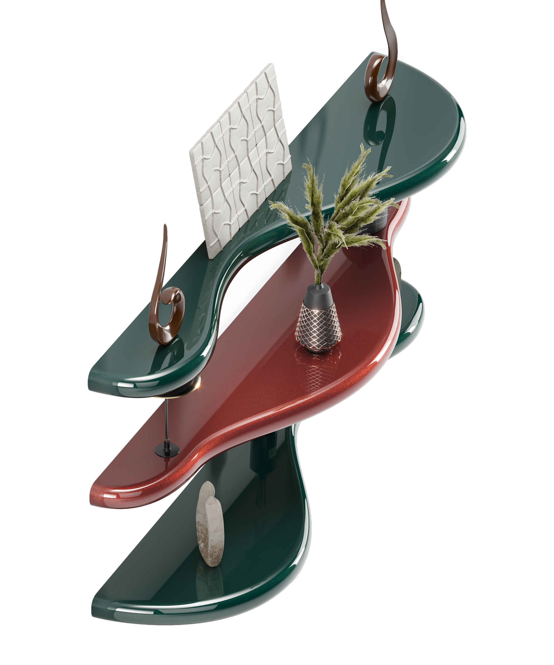 A true embodiment of modern elegance and innovative design. This uniquely shaped shelf, featuring vibrant hues of deep green and rich red, is a statement piece that brings a dynamic flair to any space. The Flicker Shelf's fluid curves and artistic form create a captivating display for your most treasured items, from art pieces and plants to books and collectibles!